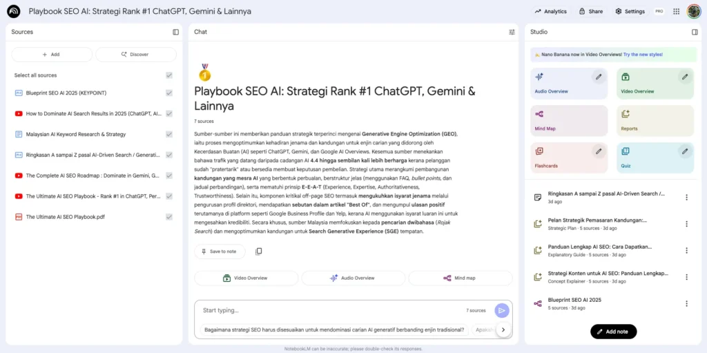 • NotebookLM akan bagi jawapan lengkap dengan sumber rujukan yang dikutip daripada bahan anda sendiri.